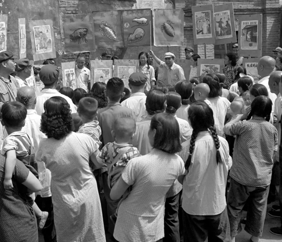 1953年6月,北京前炒面胡同愛國衛(wèi)生運動委員會分會宣傳隊正在向群眾講解蚊、蠅怎樣傳染疾病。(新華社記者毛松友 攝)