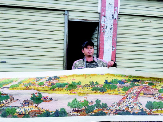 七米多長的刺繡,要三個人一起拿著才能全部展示,上面的人物栩栩如生。吳琰花了三年時間,用了72種不同顏色的線,繡成了這幅有400多個人物形象的十字繡。“橋這個地方最難繡,人流太密集,光這一小段就花了三個多月時間?!彼钢汤C上那座人流如織的大橋說。