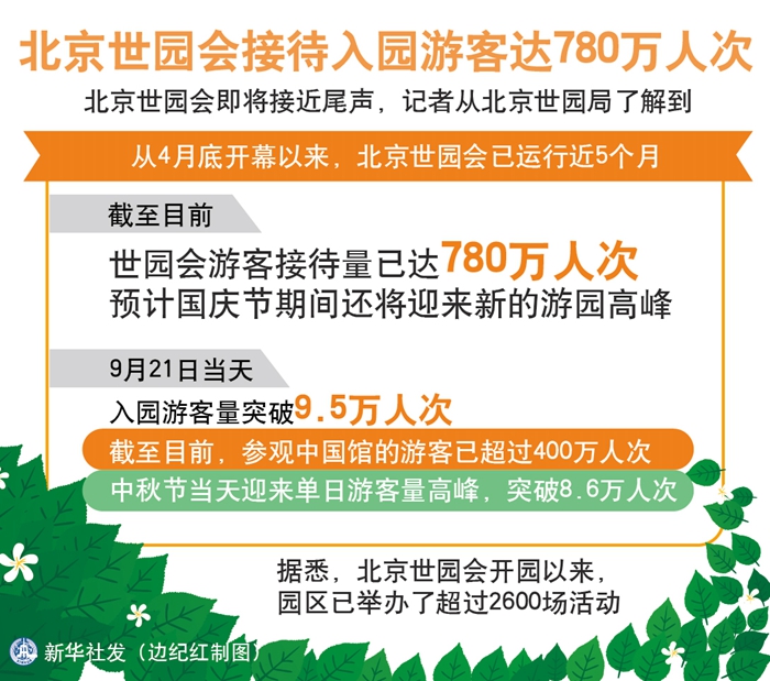 新華社北京9月23日電(魏夢佳、王雪純)北京世園會即將接近尾聲,記者從北京世園局了解到,從4月底開幕以來,北京世園會已運行近5個月,截至目前,世園會游客接待量已達780萬人次,預(yù)計國慶節(jié)期間還將迎來新的游園高峰。