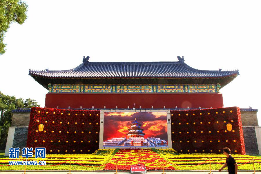 游人從北京天壇公園的立體花壇前走過(9月26日攝)。新華社發(fā)