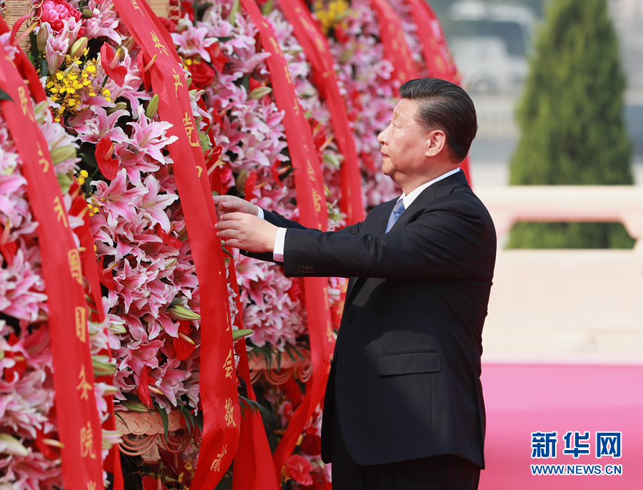 9月30日上午,習近平、李克強、栗戰(zhàn)書、汪洋、王滬寧、趙樂際、韓正、王岐山等黨和國家領(lǐng)導(dǎo)人來到北京天安門廣場,出席烈士紀念日向人民英雄敬獻花籃儀式。這是習近平整理花籃上的緞帶。 新華社記者 龐興雷 攝