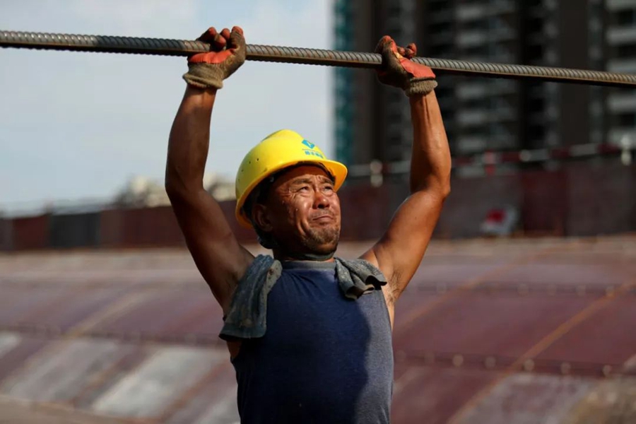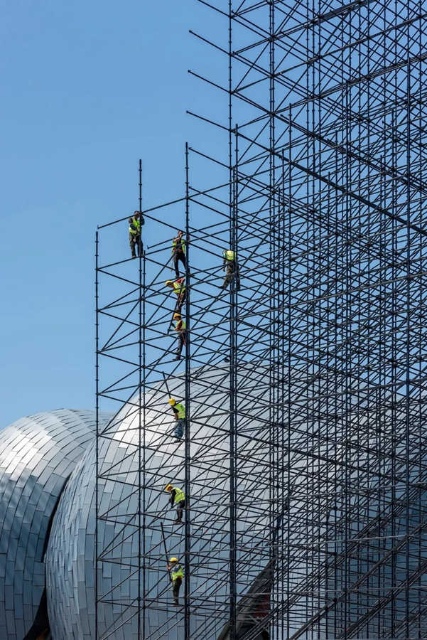 7月1日,山西大同。烈日下,數(shù)十米高的鋼架上,工人們?nèi)栽趭^戰(zhàn)。作者:王京