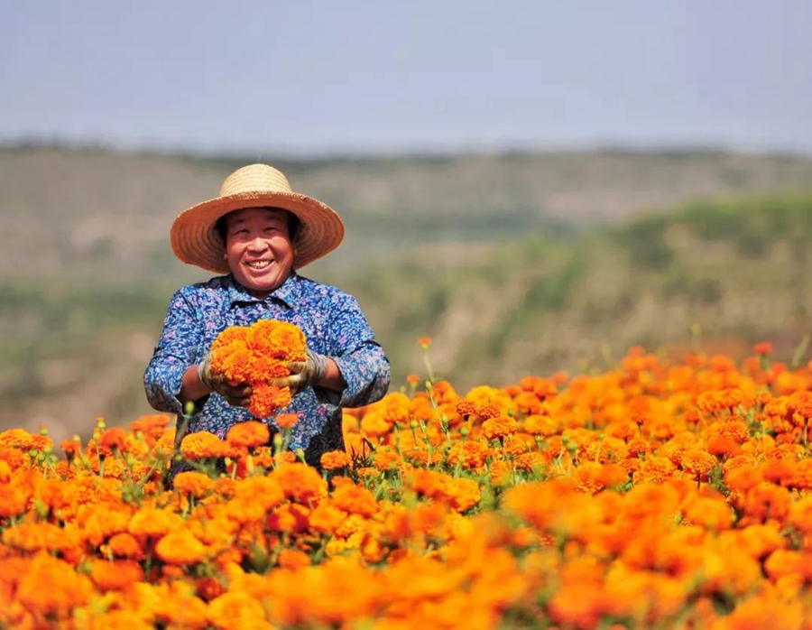 9月12日,寧夏彭陽。種植萬壽菊,不僅發(fā)展了旅游業(yè),也讓當?shù)乩习傩者^上了好日子。作者:瑾