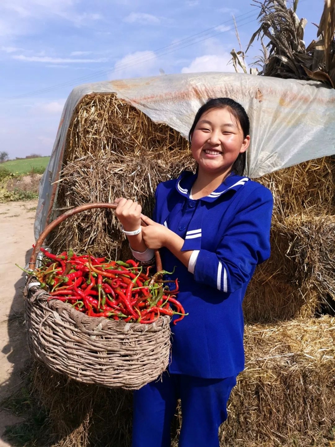 10月2日,甘肅平?jīng)?。女童提著剛采摘的辣椒,喜上眉梢。作者:花?/font>