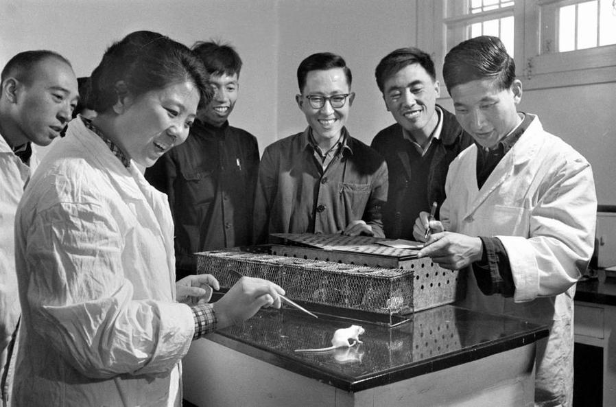 1965年9月17日,中國首次人工合成了結(jié)晶牛胰島素。圖中科學(xué)工作者正在將人工合成的產(chǎn)物注入小白鼠體內(nèi),測驗(yàn)它的生物活力。新華社資料照片