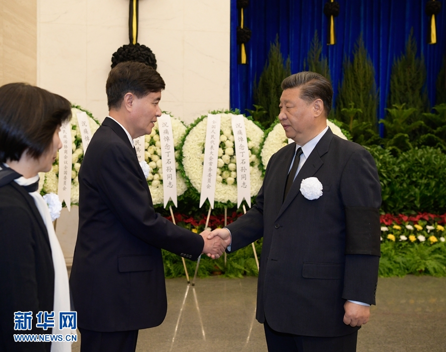 上午9時(shí)45分許,習(xí)近平、李克強(qiáng)、栗戰(zhàn)書、汪洋、王滬寧、趙樂際、韓正、王岐山等,在哀樂聲中緩步來到丁石孫同志的遺體前肅立默哀,向丁石孫同志的遺體三鞠躬,并與丁石孫同志親屬一一握手,表示慰問。