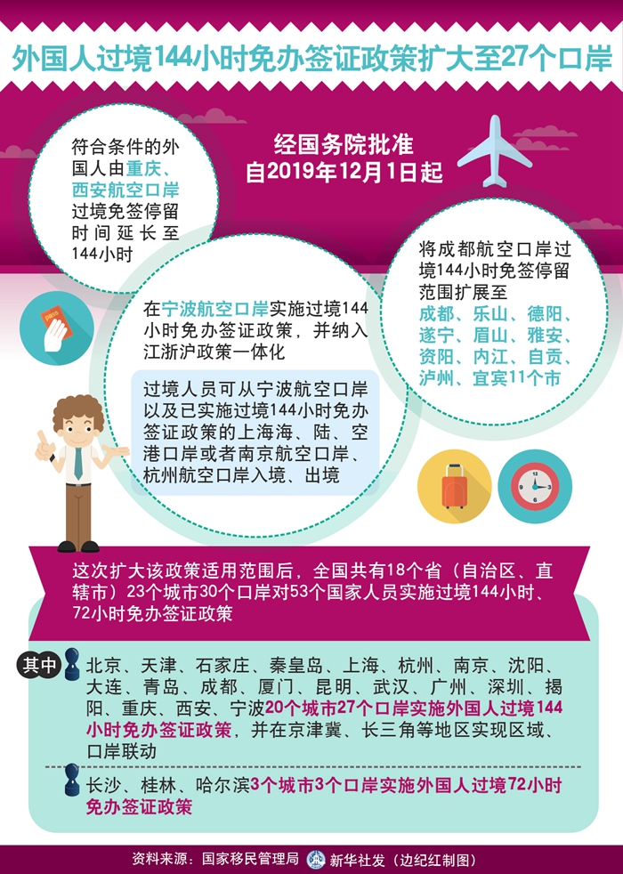 新華社北京10月23日電 記者23日從國家移民管理局新聞發(fā)布會獲悉,隨著我國對外開放不斷深入,中外交流不斷深化,為進一步促進經濟社會發(fā)展和中外人員往來,經國務院批準,自2019年12月1日起,符合條件的外國人由重慶、西安航空口岸過境免簽停留時間延長至144小時;在寧波航空口岸實施過境144小時免辦簽證政策,并納入江浙滬政策一體化,過境人員可從寧波航空口岸以及已實施過境144小時免辦簽證政策的上海海、陸、空港口岸或者南京航空口岸、杭州航空口岸入境、出境;將成都航空口岸過境144小時免簽停留范圍擴展至成都、樂山、德陽、遂寧、眉山、雅安、資陽、內江、自貢、瀘州、宜賓11個市。