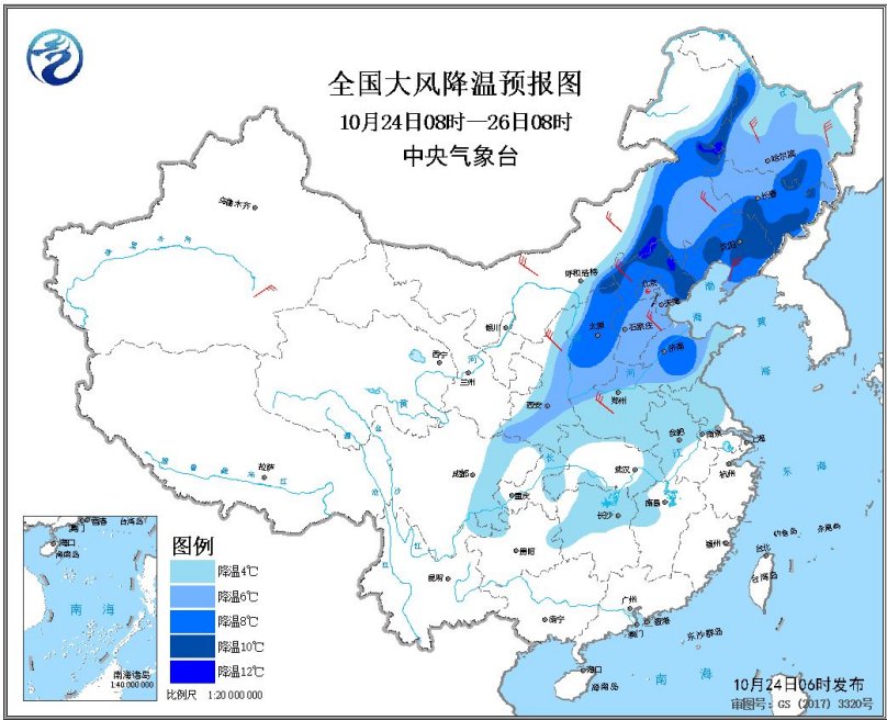而今天起,冷空氣將會繼續(xù)南下逐步影響中東部地區(qū),中央氣象臺預(yù)計,10月24日08時至26日08時,西北地區(qū)東部、東北大部、華北、黃淮、江淮、四川盆地、湖北西部和東部、湖南北部、江西西北部等地的部分地區(qū)氣溫將下降4~8℃,其中內(nèi)蒙古中部偏東和東北部、東北地區(qū)東南部等地的部分地區(qū)降溫可達10℃以上,并伴有4~6級偏北風、陣風7~8級。