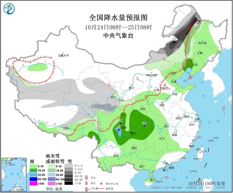 冷空氣不僅制造降溫,今明兩天還會給東北、華北等地制造雨雪天氣,同時華西地區(qū)的陰雨也將延綿不絕。中央氣象臺預(yù)計,10月24日08時至25日08時,黑龍江西部、內(nèi)蒙古中東部、甘肅南部、青海、西藏東部等地的部分地區(qū)有小到中雪或雨夾雪,其中內(nèi)蒙古中部偏北和東北部、黑龍江西北部等地有大雪,局地暴雪或大暴雪;遼寧西南部、西南地區(qū)東部、湖北西南部、湖南西北部等地的部分地區(qū)有中雨,局地大雨(25~45毫米)。