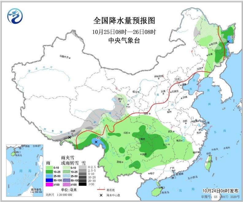10月25日08時至26日08時,內(nèi)蒙古東北部、黑龍江中部、西藏東北部和南部、青海東部和南部、甘肅河西等地的部分地區(qū)有小到中雪或雨夾雪,其中西藏南部局地有大雪。東北地區(qū)東部、西藏東南部、四川盆地中東部、湖南西部、貴州等地的部分地區(qū)有中雨,局地有大雨(25~40毫米)。