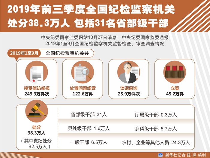 通報顯示,2019年1至9月,全國紀檢監(jiān)察機關共接受信訪舉報249.3萬件次,處置問題線索122.6萬件,談話函詢25.9萬件次,立案45.2萬件,處分38.3萬人(其中黨紀處分32.5萬人)。處分省部級干部31人,廳局級干部0.3萬人,縣處級干部1.6萬人,鄉(xiāng)科級干部5.7萬人,一般干部6.5萬人,農村、企業(yè)等其他人員24.3萬人。