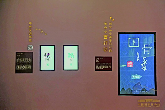 國(guó)博的甲骨文文化展雖沒(méi)有這么跌宕起伏的故事做注解,但融入信息時(shí)代特色的展示手段同樣為“科普”增色。趙永說(shuō):“觀眾有興趣來(lái)看很重要,但一般的甲骨都很小、很脆,觀賞性并不強(qiáng)。再就是看不懂文字,這個(gè)不是看看展板就能理解透的。所以做了一些多媒體的東西,包括甲骨文表情包、手繪甲骨文吉利話、全息甲骨文宇宙等?!?/p>