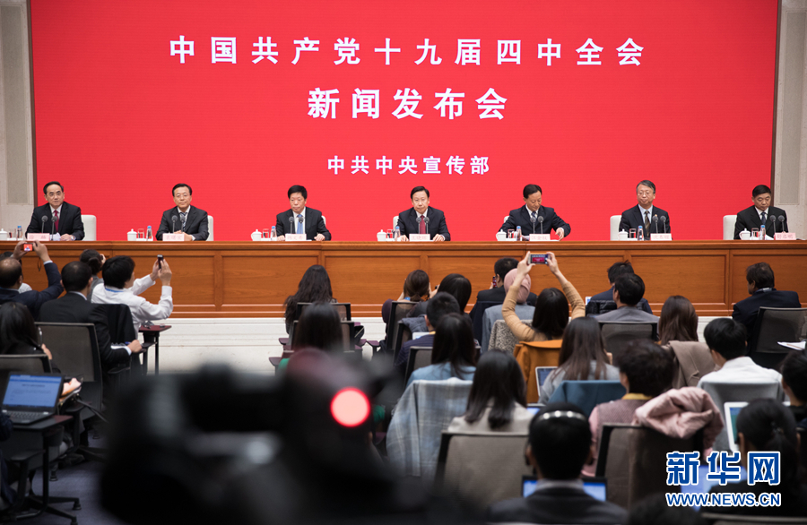 11月1日,中共中央宣傳部在北京舉行中國(guó)共產(chǎn)黨十九屆四中全會(huì)新聞發(fā)布會(huì),請(qǐng)中央宣傳部分管日常工作的副部長(zhǎng)、中央政策研究室副主任王曉暉,中央政策研究室分管日常工作的副主任江金權(quán),中央財(cái)經(jīng)委員會(huì)辦公室分管日常工作的副主任韓文秀,全國(guó)人大常委會(huì)法工委主任、港澳基本法委主任沈春耀,司法部黨組書記、副部長(zhǎng)袁曙宏,全國(guó)政協(xié)副秘書長(zhǎng)舒啟明介紹有關(guān)情況,并答記者問。中央宣傳部副部長(zhǎng)、國(guó)務(wù)院新聞辦公室主任徐麟主持新聞發(fā)布會(huì)。 新華社記者金立旺攝