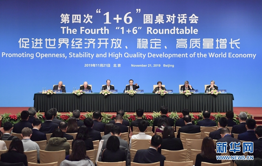11月21日,國務(wù)院總理李克強在北京釣魚臺國賓館同世界銀行行長馬爾帕斯、國際貨幣基金組織總裁格奧爾基耶娃、世界貿(mào)易組織副總干事沃爾夫、國際勞工組織總干事賴德、經(jīng)濟合作與發(fā)展組織秘書長古里亞和金融穩(wěn)定理事會主席夸爾斯舉行第四次“1+6”圓桌對話會后共同會見記者。 新華社記者 岳月偉 攝