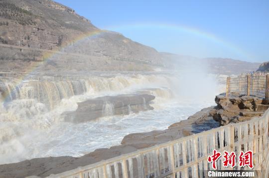 資料圖:小雪時(shí)節(jié),黃河壺口瀑布出現(xiàn)冰掛,天空中伴有一道彩虹?!埥?攝