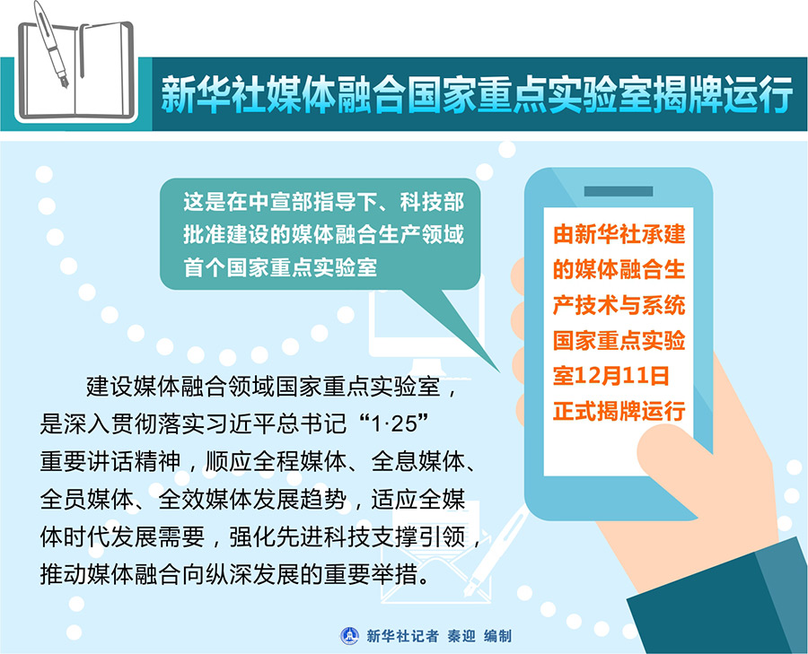 新華社北京12月11日電? 由新華社承建的媒體融合生產(chǎn)技術(shù)與系統(tǒng)國(guó)家重點(diǎn)實(shí)驗(yàn)室12月11日正式揭牌運(yùn)行。這是在中宣部指導(dǎo)下、科技部批準(zhǔn)建設(shè)的媒體融合生產(chǎn)領(lǐng)域首個(gè)國(guó)家重點(diǎn)實(shí)驗(yàn)室。建設(shè)媒體融合領(lǐng)域國(guó)家重點(diǎn)實(shí)驗(yàn)室,是深入貫徹落實(shí)習(xí)近平總書(shū)記“1·25”重要講話精神,順應(yīng)全程媒體、全息媒體、全員媒體、全效媒體發(fā)展趨勢(shì),適應(yīng)全媒體時(shí)代發(fā)展需要,強(qiáng)化先進(jìn)科技支撐引領(lǐng),推動(dòng)媒體融合向縱深發(fā)展的重要舉措。