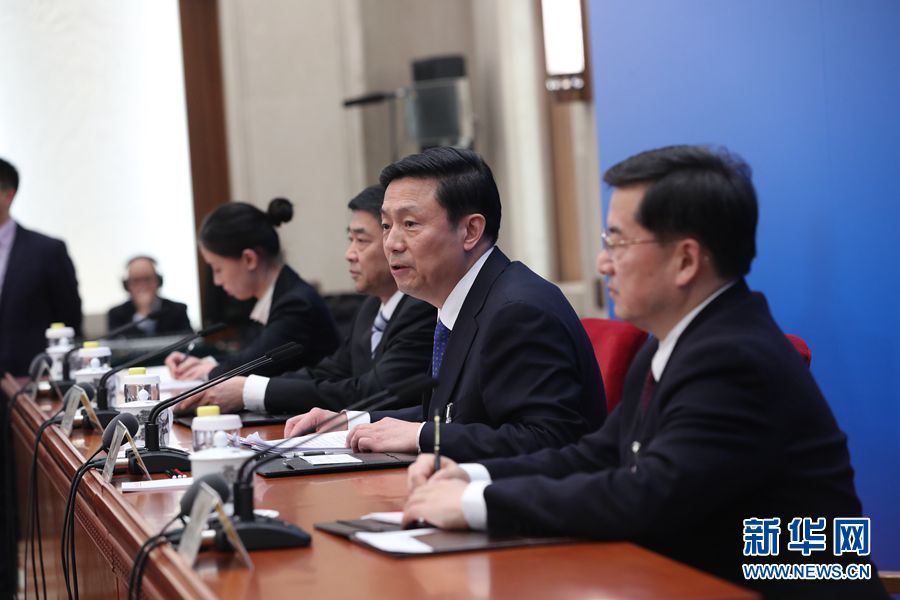 全國(guó)政協(xié)十三屆二次會(huì)議新聞發(fā)布會(huì)于3月2日15:00在人民大會(huì)堂一層新聞發(fā)布廳召開,大會(huì)新聞發(fā)言人郭衛(wèi)民向中外媒體介紹本次大會(huì)有關(guān)情況并回答記者提問(wèn)。圖為新聞發(fā)言人郭衛(wèi)民(右二)介紹本次大會(huì)有關(guān)情況。新華網(wǎng)/中國(guó)政府網(wǎng) 翟子赫 攝