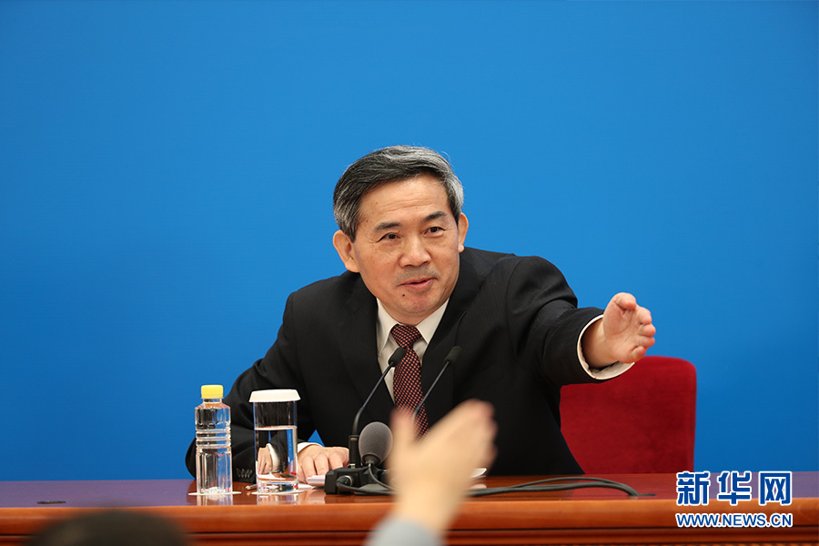 十三屆全國人大二次會議3月4日上午11時15分在人民大會堂新聞發(fā)布廳舉行新聞發(fā)布會,由大會發(fā)言人張業(yè)遂就大會議程和人大工作相關的問題回答中外記者提問。圖為新聞發(fā)布會主持人何紹仁。新華網(wǎng)/中國政府網(wǎng) 陳杰 攝