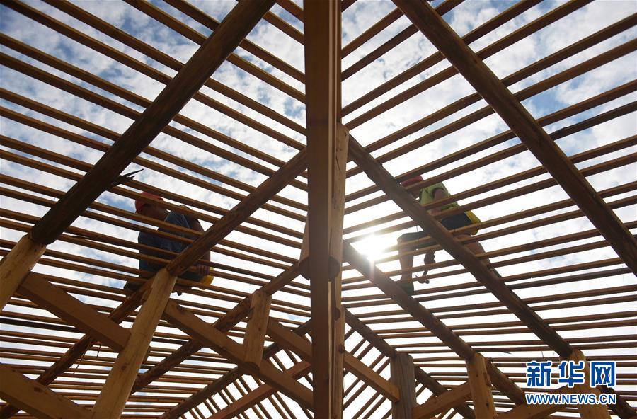 在湖北省宣恩縣曉關(guān)侗族鄉(xiāng),工人在建設(shè)吊腳樓(2018年7月26日攝)。2018年,當?shù)卣_始修建6座新的侗寨吊腳樓,為符合易地搬遷政策的貧困戶實施搬遷。新華社發(fā)(王俊 攝)