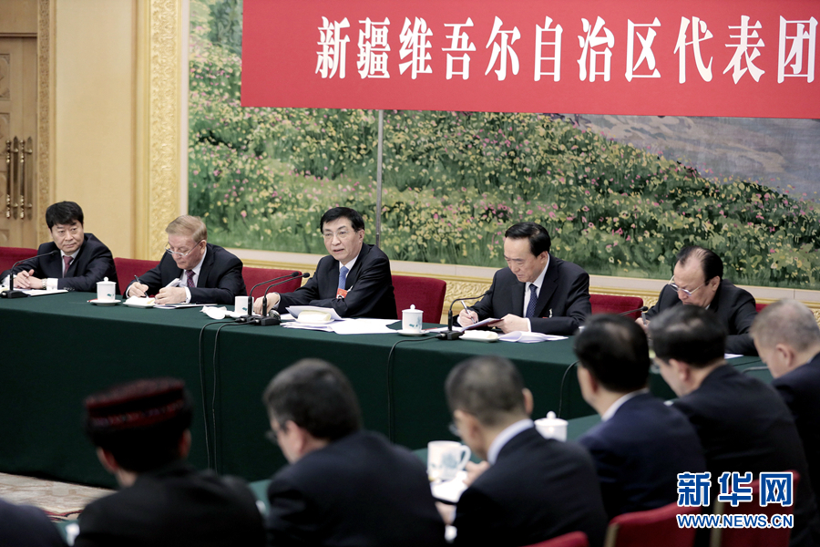 3月10日,中共中央政治局常委、中央書記處書記王滬寧參加十三屆全國人大二次會議新疆代表團的審議。 新華社記者 劉彬 攝