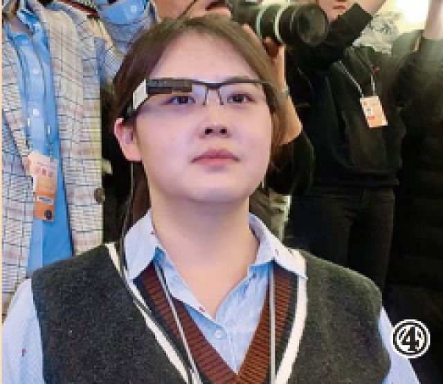 ↑3月8日,新華社記者在“部長通道”使用智能AR直播眼鏡。
