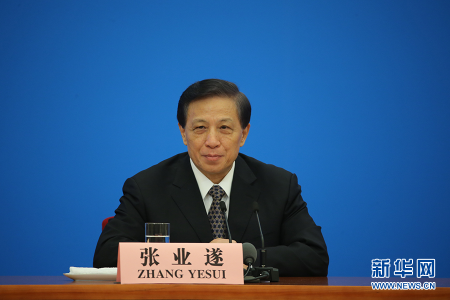 3月15日上午十三屆全國人大二次會議閉幕后,國務(wù)院總理李克強在人民大會堂三樓金色大廳會見采訪十三屆全國人大二次會議的中外記者并回答記者提出的問題。圖為大會發(fā)言人張業(yè)遂。新華網(wǎng)/中國政府網(wǎng) 劉廈 攝?