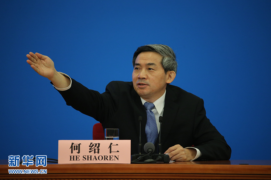 3月15日上午十三屆全國人大二次會議閉幕后,國務院總理李克強在人民大會堂三樓金色大廳會見采訪十三屆全國人大二次會議的中外記者并回答記者提出的問題。圖為記者會主持人何紹仁。新華網(wǎng)/中國政府網(wǎng) 劉廈 攝??
