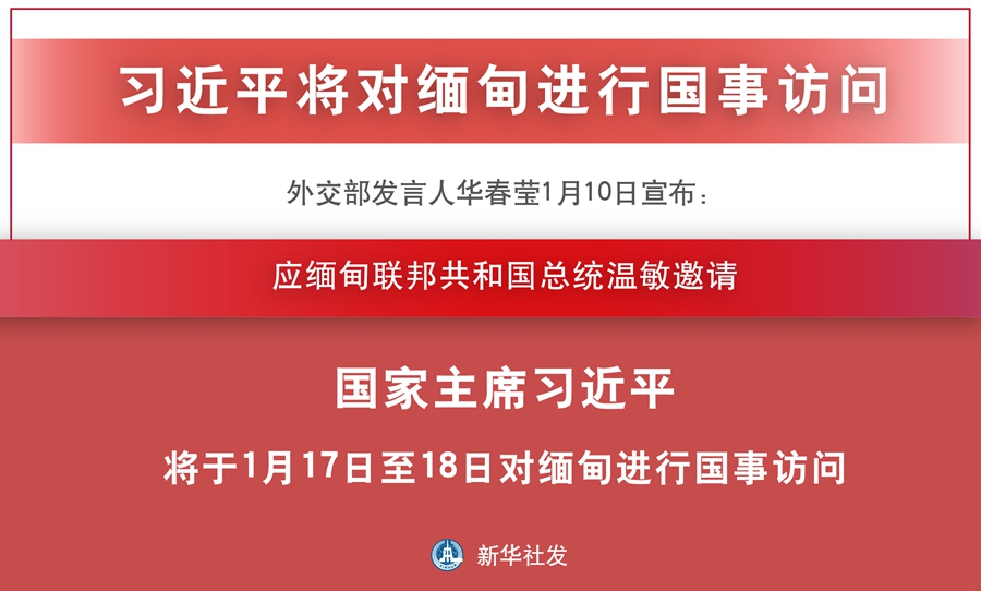 新華社北京1月10日電 外交部發(fā)言人華春瑩10日宣布:應(yīng)緬甸聯(lián)邦共和國(guó)總統(tǒng)溫敏邀請(qǐng),國(guó)家主席習(xí)近平將于1月17日至18日對(duì)緬甸進(jìn)行國(guó)事訪問。