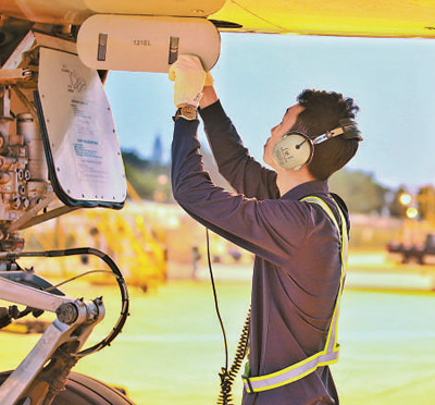 10日,機務人員進行起飛前的各項檢查。當日,??诿捞m機場飛往北京大興機場的首個航班順利起航。朱榮鵬 紀巧珠攝影報道(影像中國)