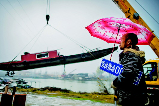 2019年12月25日下午,位于長(zhǎng)江中游的湖北省洪湖市螺山鎮(zhèn)長(zhǎng)江捕撈村陰雨綿綿,起重機(jī)、挖掘機(jī)、切割工具發(fā)出的轟鳴聲不絕于耳,57歲的漁民夏明星看著他祖祖輩輩謀生的家伙什——一艘10多米長(zhǎng)的鐵制漁船被拆解,久久不愿離去,眼里不自覺地泛起了淚花。