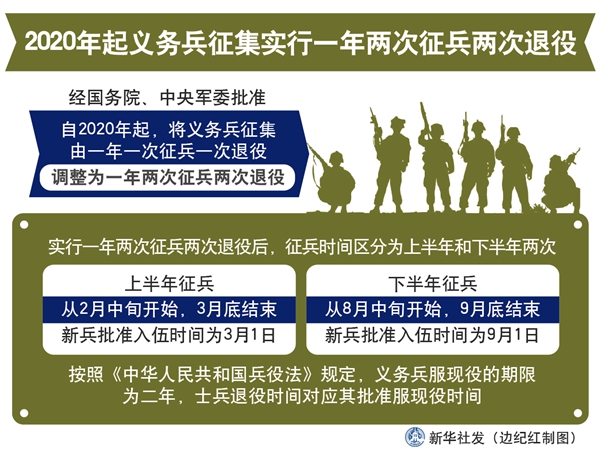 新華社北京1月16日電(記者賈啟龍)經(jīng)國務院、中央軍委批準,自2020年起,將義務兵征集由一年一次征兵一次退役,調整為一年兩次征兵兩次退役。