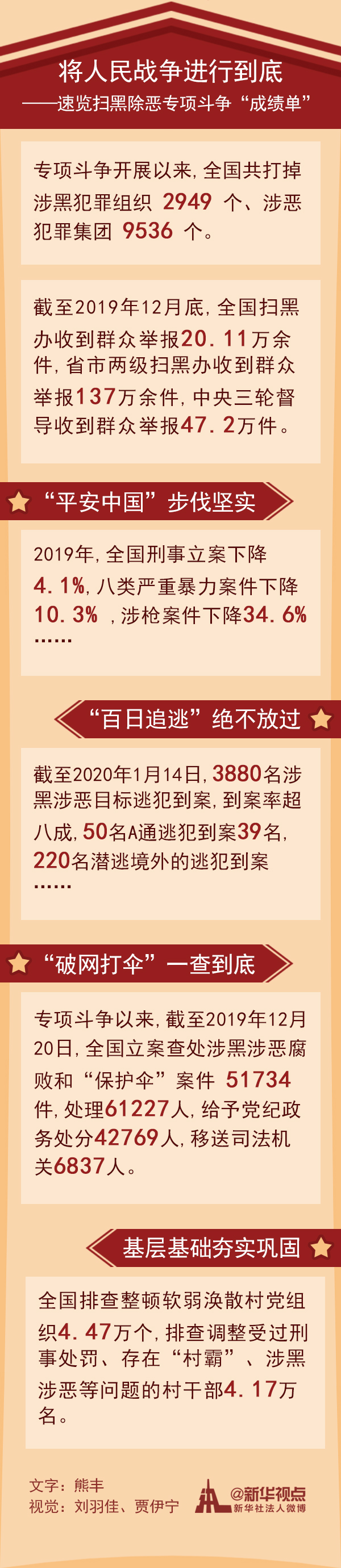 專項斗爭以來,截至2019年12月20日,全國立案查處涉黑涉惡腐敗和“保護傘”案件51734件,處理61227人,給予黨紀(jì)政務(wù)處分42769人,移送司法機關(guān)6837人。