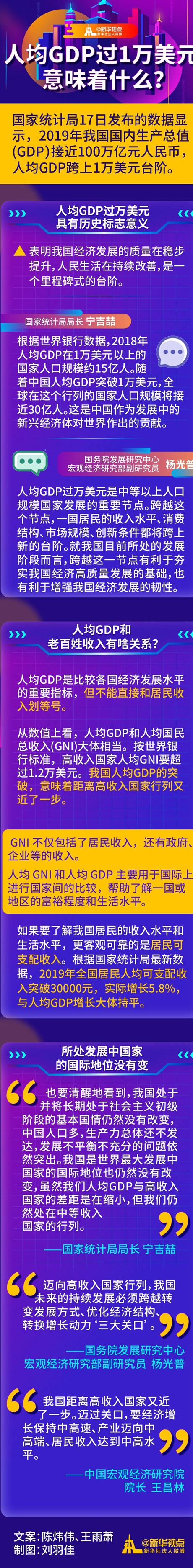經(jīng)濟(jì)總量接近100萬億元、人均國(guó)內(nèi)生產(chǎn)總值突破1萬美元,國(guó)家統(tǒng)計(jì)局17日發(fā)布的2019年中國(guó)經(jīng)濟(jì)成績(jī)單,凸顯中國(guó)經(jīng)濟(jì)里程碑式的新跨越。