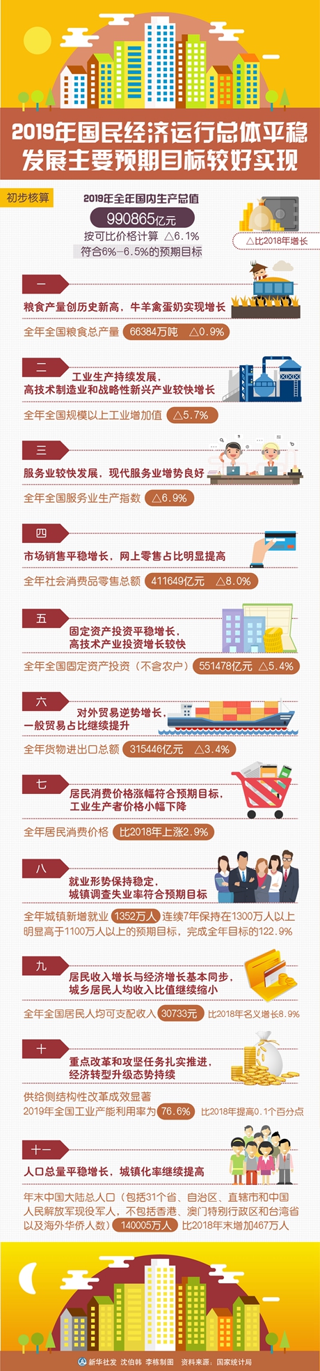 “國(guó)民經(jīng)濟(jì)運(yùn)行總體平穩(wěn)、穩(wěn)中有進(jìn),發(fā)展質(zhì)量穩(wěn)步提升,主要預(yù)期目標(biāo)較好實(shí)現(xiàn),為全面建成小康社會(huì)奠定堅(jiān)實(shí)基礎(chǔ)?!眹?guó)家發(fā)展改革委副主任兼國(guó)家統(tǒng)計(jì)局局長(zhǎng)寧吉喆評(píng)價(jià)說。
