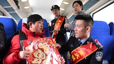 春節(jié)臨近,列車車窗上貼著窗花,車廂內(nèi)張燈結(jié)彩。為了讓老鄉(xiāng)們快樂(lè)回家,貴州團(tuán)省委組織的青年文藝志愿者與廣鐵集團(tuán)廣州客運(yùn)段動(dòng)車2隊(duì)的乘務(wù)員們一起在車廂表演起豐富多彩的文藝節(jié)目。