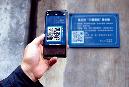 2018年10月22日,衢州市龍游縣東華街道張王村的工作人員通過(guò)“龍游通”掃描住戶門(mén)前二維碼了解信息 韓傳號(hào)攝