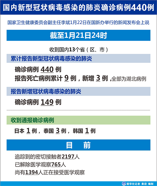 截至1月21日24時,國家衛(wèi)健委收到國內13個?。▍^(qū)、市)累計報告新型冠狀病毒感染的肺炎確診病例440例,報告死亡病例累計9例,新增3例,全部為湖北病例。
