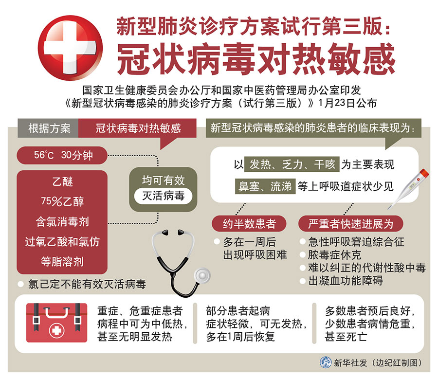 新華社北京1月23日電(記者田曉航、王秉陽)為進(jìn)一步指導(dǎo)全國科學(xué)規(guī)范做好新型冠狀病毒感染的肺炎病例診斷和醫(yī)療救治工作,在組織專家對診療方案進(jìn)行修訂基礎(chǔ)上,國家衛(wèi)生健康委員會辦公廳和國家中醫(yī)藥管理局辦公室印發(fā)《新型冠狀病毒感染的肺炎診療方案(試行第三版)》,23日公布。方案涉及冠狀病毒病原學(xué)特點、此次疫情的臨床特點、病例定義、鑒別診斷、病例的發(fā)現(xiàn)與報告等方面內(nèi)容,給出了包括中醫(yī)治療在內(nèi)的治療方案。