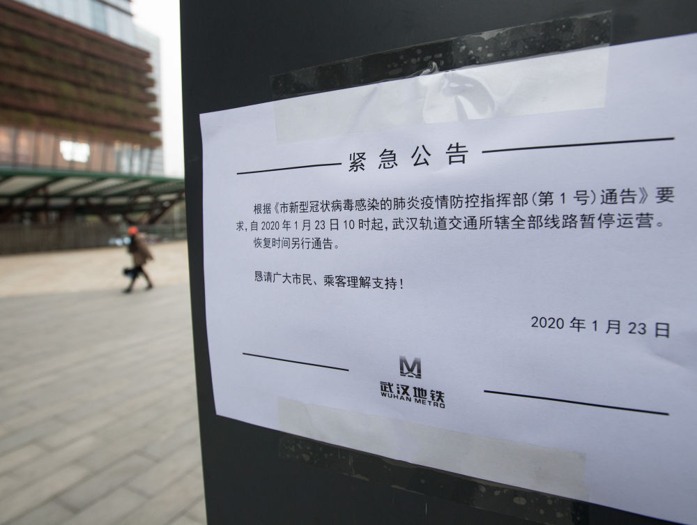 1月23日在武漢地鐵汪家墩站出口拍攝的地鐵停運(yùn)通告(新華社記者 肖藝九 攝)