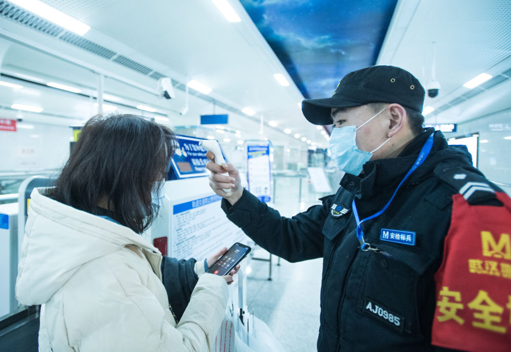 1月23日上午9時(shí)許,在武漢地鐵8號(hào)線汪家墩站,工作人員對(duì)旅客進(jìn)行體溫檢測(cè)。(新華社記者 肖藝九 攝)