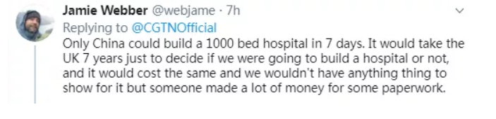“只有中國才能在7天內(nèi)修建一個容納1000張床位的醫(yī)院了!這在英國,花上7年的時間也就只夠決定到底能不能建造一個醫(yī)院.......”