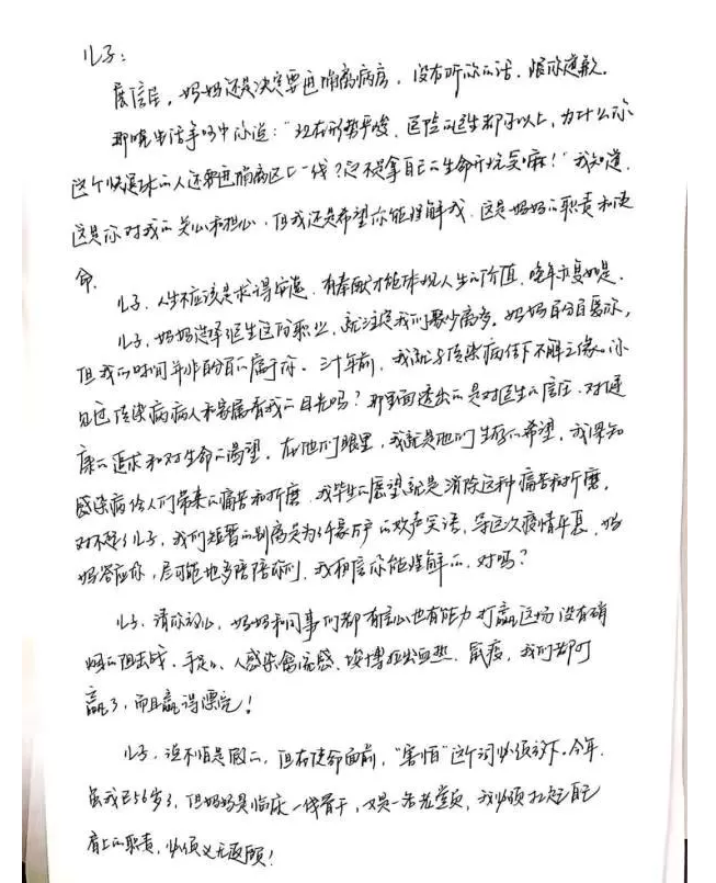 在較早收治確診病例的湖南省郴州市第二人民醫(yī)院,一封抗疫醫(yī)生的家書引人注目。家書是作為醫(yī)生的媽媽,在即將進(jìn)入隔離病房前,寫給帶女朋友回家過(guò)年的兒子的。