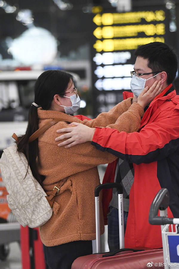 1月26日,重慶市醫(yī)療隊隊員、重慶醫(yī)科大學(xué)附屬第一醫(yī)院呼吸內(nèi)科主治醫(yī)師蔣磊同未婚妻高佳在重慶江北國際機(jī)場道別。兩人原定于2月2日領(lǐng)結(jié)婚證,但現(xiàn)在只能推遲了。“雖然我很擔(dān)心他,也很舍不得他,但我還是鼓勵他去好好工作”,高佳說,“我們現(xiàn)在計劃改在5月20日再去領(lǐng)證,我希望他加油,我等我的英雄勝利歸來”。他們的短暫離別,將換來更多人早日團(tuán)聚。26日晚,130余名醫(yī)務(wù)工作者組成的重慶市醫(yī)療隊從重慶出發(fā),前往湖北省孝感市支援。(記者 王全超)