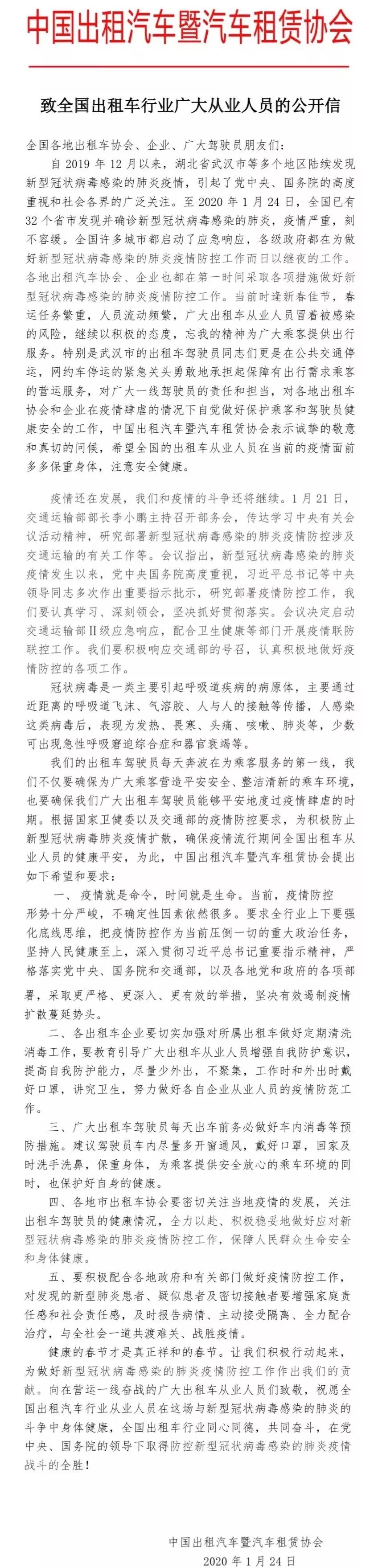 近日,中國出租汽車暨汽車租賃協(xié)會發(fā)布公開信,倡議全國出租車行業(yè)廣大從業(yè)人員把疫情防控作為當前壓倒一切的重大政治任務(wù)。出租車駕駛員每天出車前務(wù)必做好車內(nèi)消毒等預(yù)防措施,采取更嚴格、更深入、更有效的舉措,堅決有效遏制疫情擴散蔓延勢頭。?
