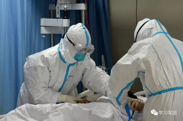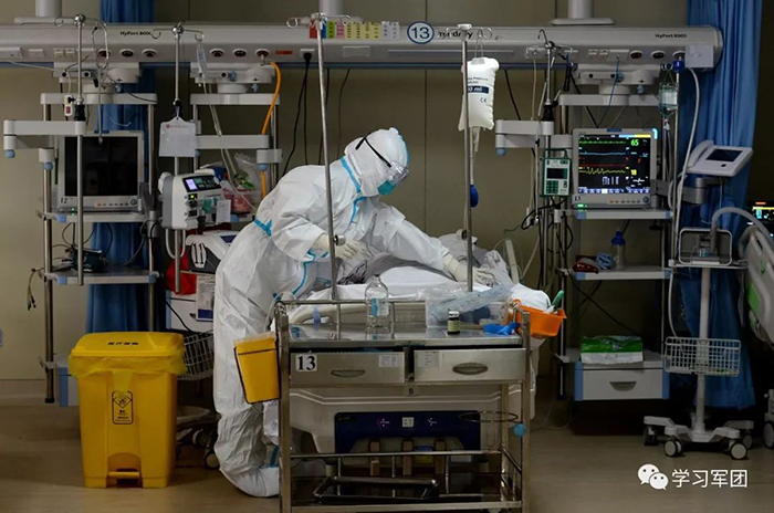 1月27日上午,海軍軍醫(yī)大學醫(yī)療隊醫(yī)護人員在漢口醫(yī)院重癥監(jiān)護室對新型冠狀病毒感染的肺炎患者進行救治。醫(yī)護人員對患者進行輸液護理。解放軍報記者范顯海攝