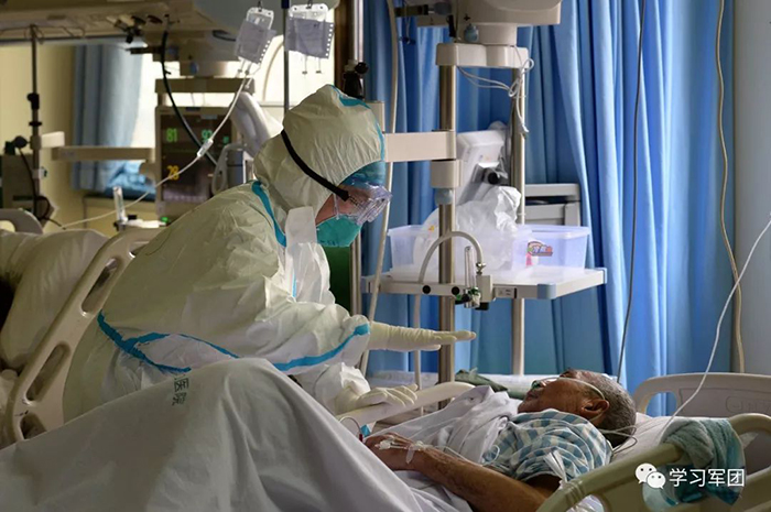 1月27日上午,海軍軍醫(yī)大學醫(yī)療隊醫(yī)護人員在漢口醫(yī)院重癥監(jiān)護室對新型冠狀病毒感染的肺炎患者進行救治。醫(yī)護人員加強巡視,觀察輸液滴數(shù)。解放軍報記者范顯海攝