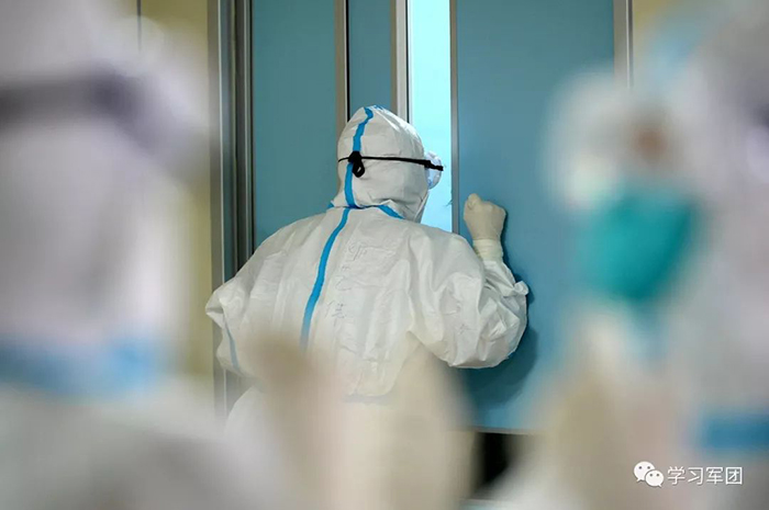 1月27日上午,海軍軍醫(yī)大學醫(yī)療隊醫(yī)護人員在漢口醫(yī)院重癥監(jiān)護室對新型冠狀病毒感染的肺炎患者進行救治。醫(yī)護人員與監(jiān)護室外人員隔門交流。解放軍報記者范顯海攝