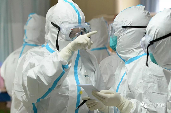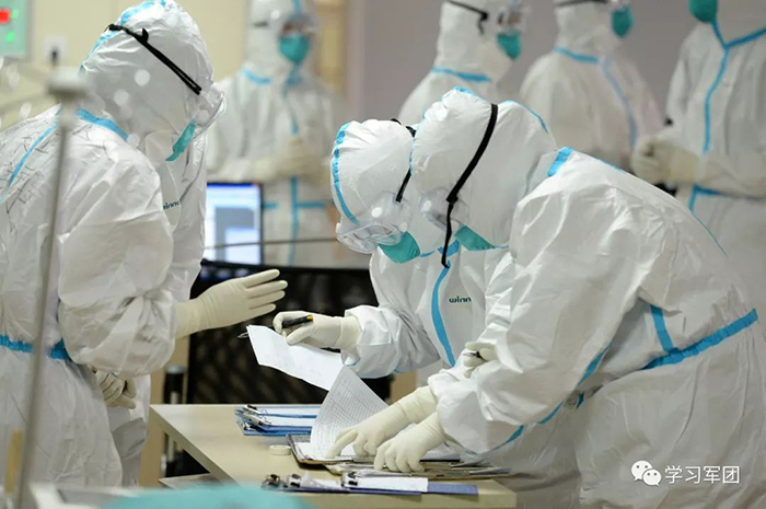 1月27日上午,海軍軍醫(yī)大學醫(yī)療隊醫(yī)護人員在漢口醫(yī)院重癥監(jiān)護室對新型冠狀病毒感染的肺炎患者進行救治。醫(yī)護人員研究重癥患者治療方案。解放軍報記者范顯海攝