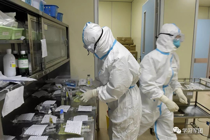 1月27日上午,海軍軍醫(yī)大學醫(yī)療隊醫(yī)護人員在漢口醫(yī)院重癥監(jiān)護室對新型冠狀病毒感染的肺炎患者進行救治。醫(yī)護人員配備藥品。解放軍報記者范顯海攝