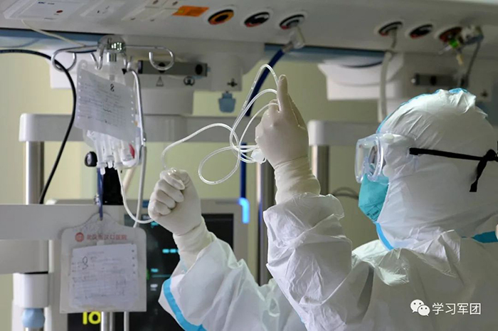 1月27日上午,海軍軍醫(yī)大學醫(yī)療隊醫(yī)護人員在漢口醫(yī)院重癥監(jiān)護室對新型冠狀病毒感染的肺炎患者進行救治。醫(yī)護人員查看患者輸液導管是否通暢。解放軍報記者范顯海攝